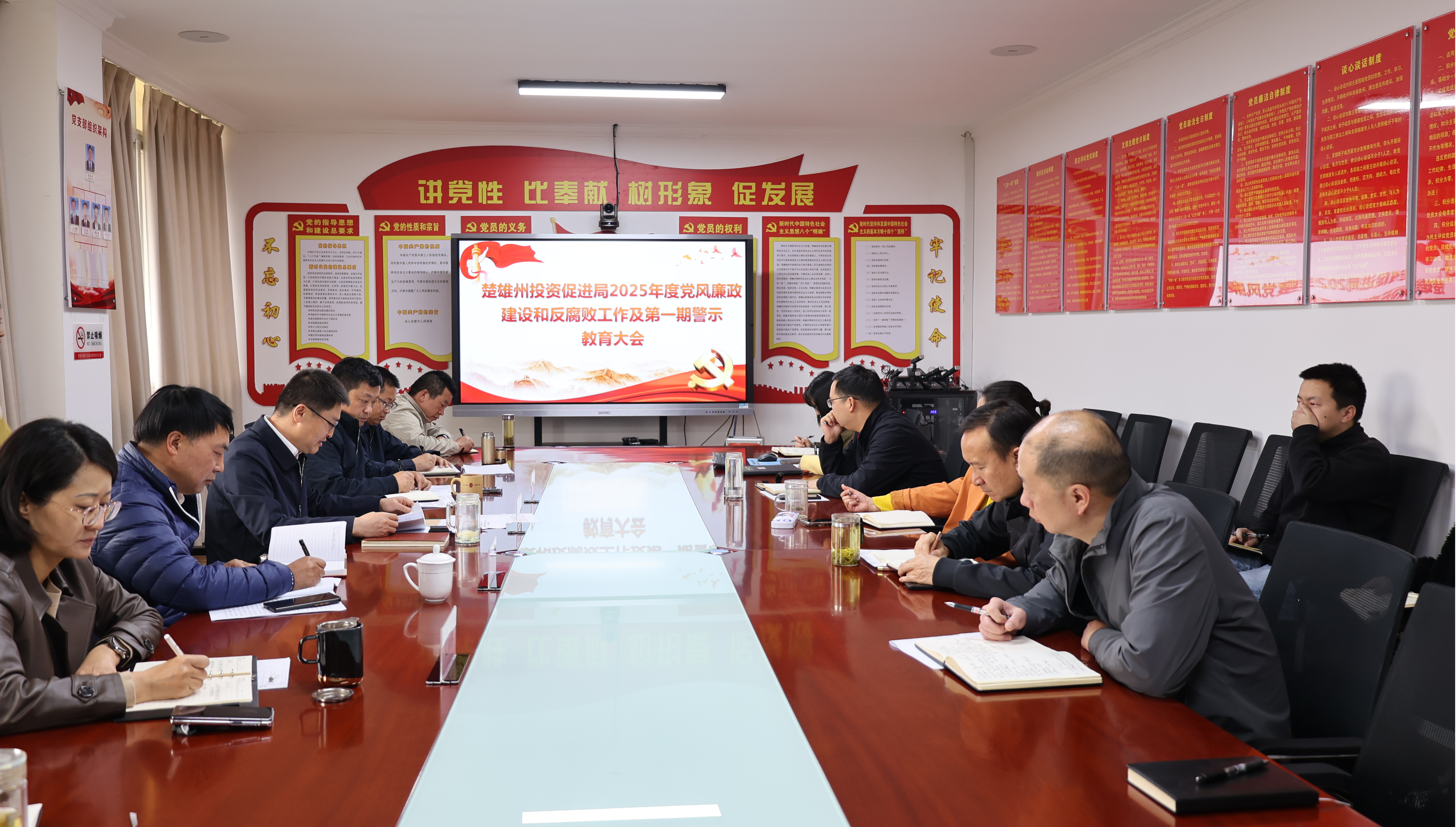 为深入学习贯彻习近平新时代中国特色社会主义思想、习近平总书记关于党的建设的重要思想、党的自我革命的重要思想、全面加强党的纪律建设的重要论述和中央及省州纪委全会精神,深刻领悟“两个确立”的决定性意义,增强“四个意识”、坚定“四个自信”、做到“两个维护”,坚持用改革精神和严的标准管党治党,深入践行省委“主动想”“扎实干”“看效果”抓工作“三部曲”和楚雄州“7天工作法”“三单制”,推动落实全面从严治党政治责任,纵深推进正风肃纪反腐,为全州投资促进工作提供坚强的作风保障、纪律保障,2025年3月17日上午,楚雄州投资促进局召开2025年全面从严治党暨党风廉政建设和反腐败工作及第一期警示教育大会。