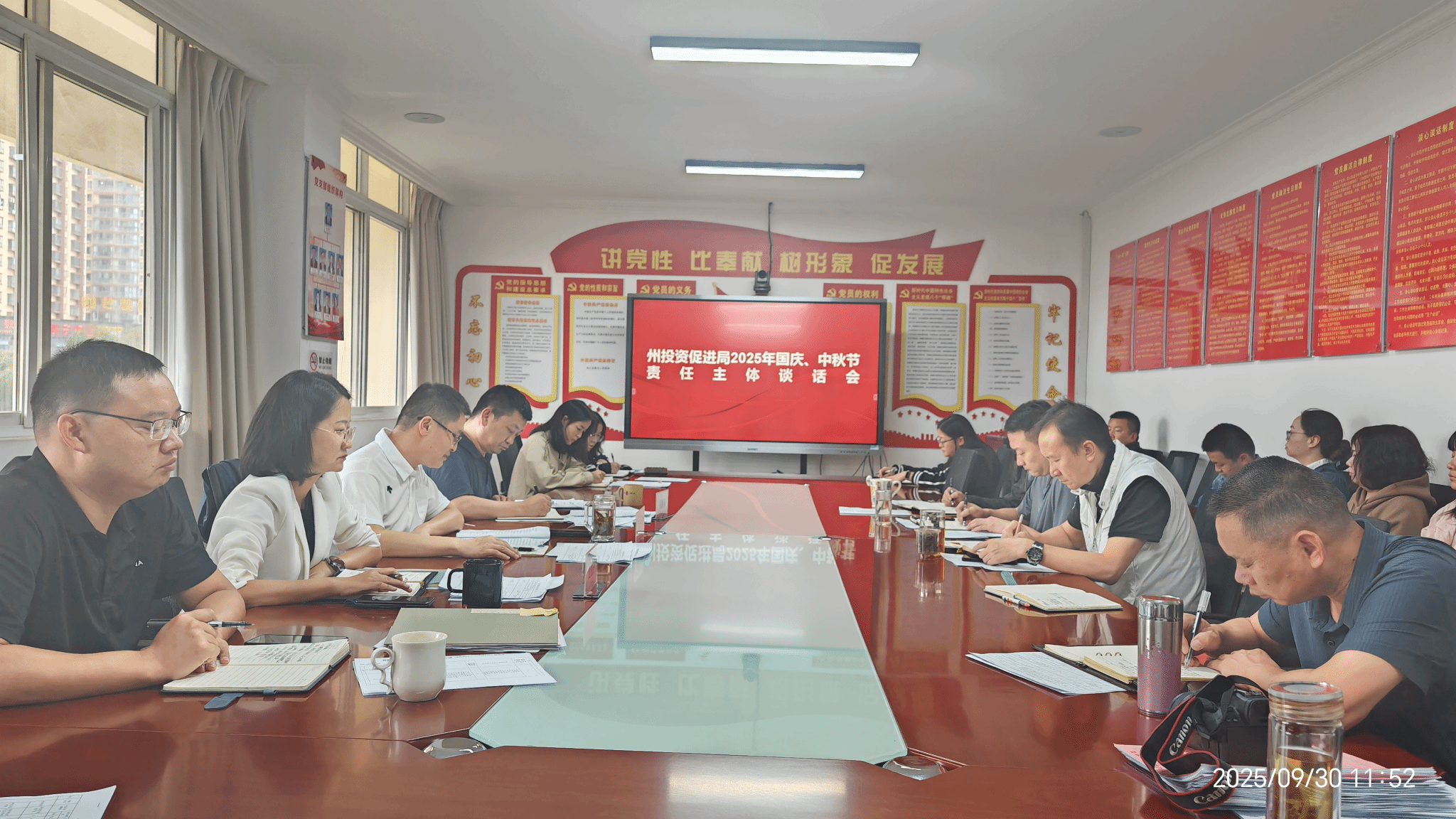 “双节”将至,为进一步强化党风廉政建设主体责任,不断筑牢党员干部拒腐防变思想防线,营造风清气正的节日氛围,9月30日上午,州投资促进局召开中秋国庆节前责任主体谈话会,全体干部职工参加会议。