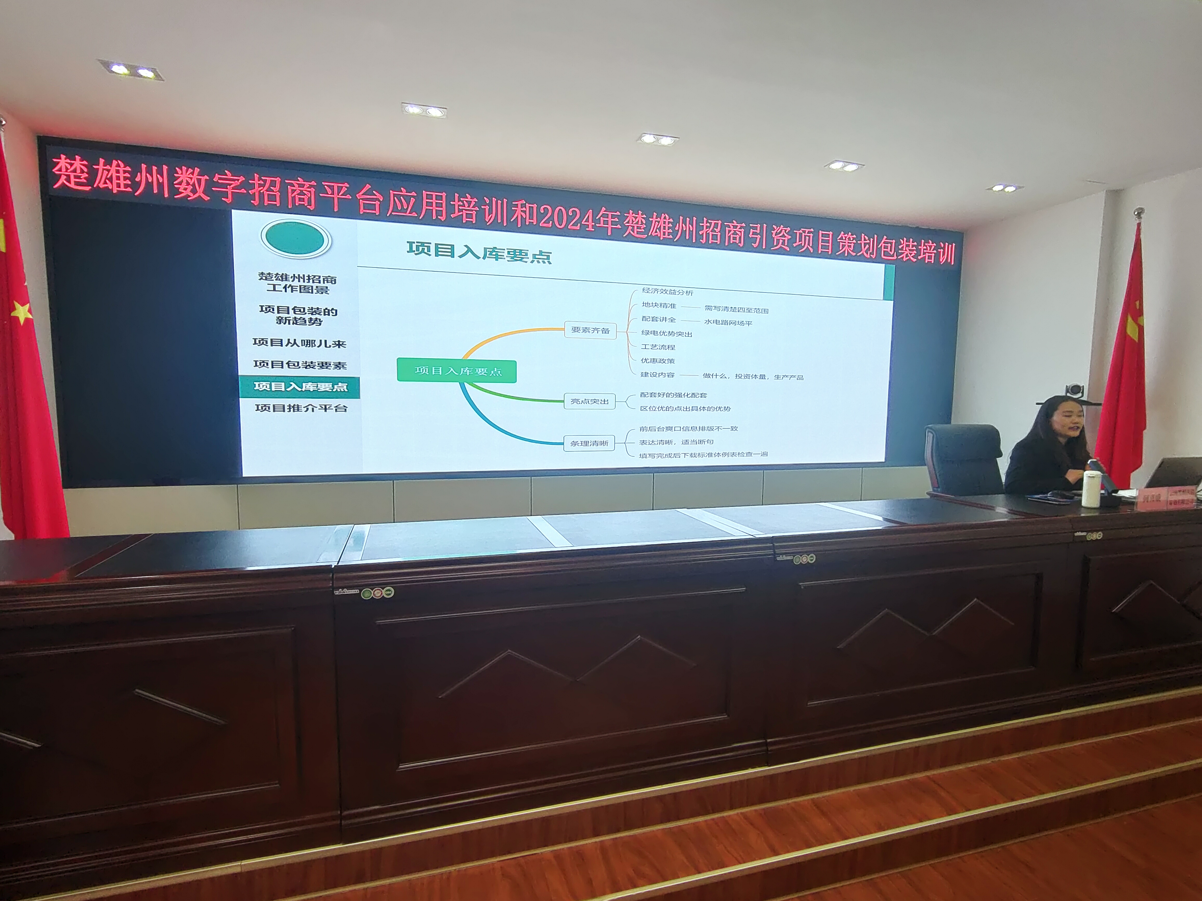 州投资促进局副局长夏丽萍主持,并做开班动员讲话,项目开发科对2023年楚雄州招商引资项目开发工作开展情况进行通报,并提出了2024年招商引资重点项目策划包装的具体要求。云南黑蝎策划有限公司相关人员分别就云南省数字招商平台的现状、楚雄州数字招商平台应用图景及后台操作、招商引资项目策划包装进行培训。
