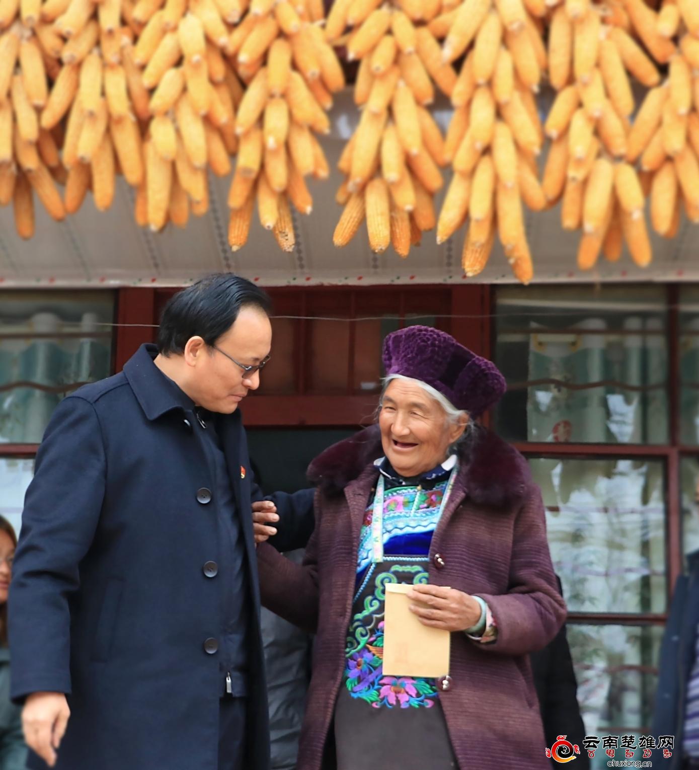 “春节快到了,我和县、乡党委、政府有关同志来看望大家,给大家拜个早年。”在武定发窝乡困难群众禹聪贵、李全富、朱仁赐、李美英、申晓梅家中,迟中华看房、看粮、看生产,与他们拉家常、话发展。迟中华勉励大家,要勤勤恳恳抓生产、抓增收,孩子们要认真学习,用知识改变命运,用技能斩断穷根。政府部门要巩固拓展脱贫攻坚成果,抓紧建立健全“一平台、三机制”,接续推进脱贫攻坚成果与乡村振兴有效衔接。