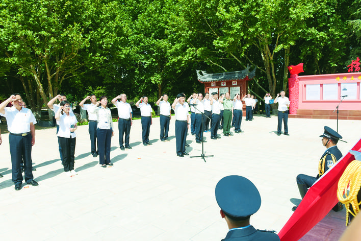 州委常委班子在革命烈士纪念碑和毕昌杰烈士铜像前举行缅怀仪式。参加活动的州委常委班子成员怀着无比崇敬的心情向革命先烈敬献花篮,深切感受革命先烈的坚强党性和英雄气概。面对鲜艳的党旗,州委书记杨斌带领大家重温入党誓词。