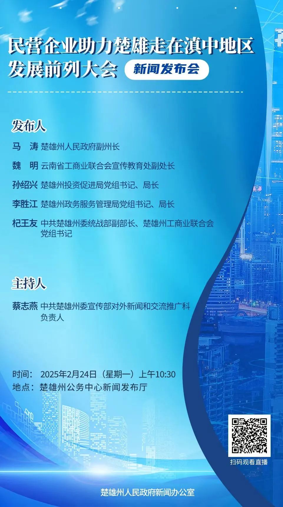 2月24日上午10:30,楚雄州人民政府新闻办公室在楚雄州会务中心一楼新闻发布厅召开民营企业助力楚雄走在滇中地区发展前列大会新闻发布会,介绍相关情况并回答记者提问。